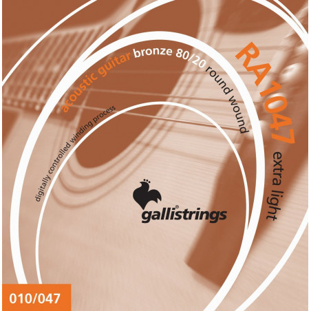 Powlekane struny do gitary akustycznej odznaczające się jasnym, donośnym brzmieniem. Okrągła owijka zapewnia wysoką responsywność oraz podatność na artykulację. Struny Galli RA1047 charakteryzują się długą żywotnością oraz odpornością na korozję.