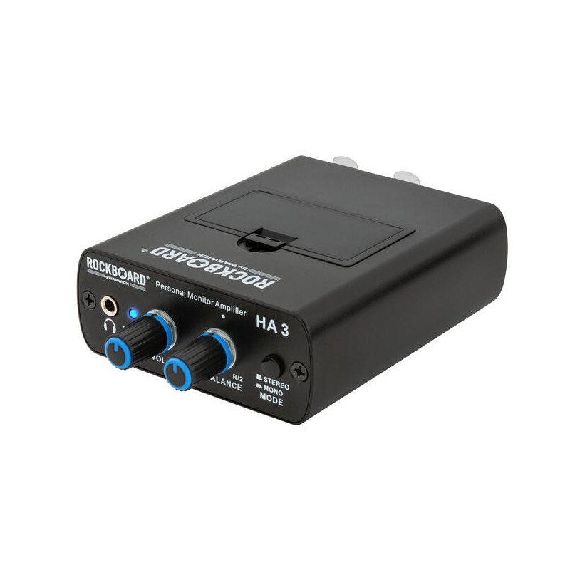 RockBoard® HA 3 In-Ear Monitor Amplifier to dwukanałowy system monitorowania dla muzyków, oferujący lekką, przenośną konstrukcję idealną dla artystów pracujących w jednej pozycji na scenie. Zapewnia profesjonalny dźwięk o wysokiej głośności i wierności, umożliwiając odsłuch stereo lub monitorowanie dwóch niezależnych sygnałów. Można go nosić na pasku lub zamontować na statywie mikrofonowym dzięki zintegrowanemu adapterowi. Zasilany bateryjnie, posiada wskaźnik LED informujący o stanie baterii oraz łatwo dostępną komorę baterii. Alternatywnie może być zasilany z zasilacza 9 VDC. Wyposażony w dwa combo wejścia TRS/XLR i wyjście słuchawkowe 3,5 mm, pozwala na regulację głośności i panoramy.