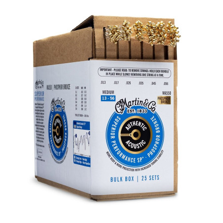 Martin BOXMA550 Medium (13-56) AA Phosphor Bronze to profesjonalny, trwały i ekonomiczny zestaw 25 kompletów strun do gitary akustycznej, który zaspokoi potrzeby zarówno muzyków amatorów, jak i profesjonalistów. Dzięki wysokiej jakości stopowi fosforowo-miedzianemu zapewnia pełne, ciepłe brzmienie i komfort gry przez długi czas.